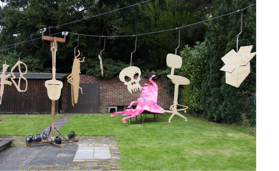 The main piece is a funicular, where silhouette cutouts are gently buncing back and forth in an endless circuite. Waste materials, like bicycle wheels, metal trash, wire, wood, rubber tubes and sand paper, are recycled in a low-tech rail that sings a beautiful symphony of mechanical sounds, that carries across situations and objects of everyday life: TV-series, news, fixing the car, combing one’s hair, up-loading on the Internet, fixing a plumbing issue or cutting a slice of cheese.