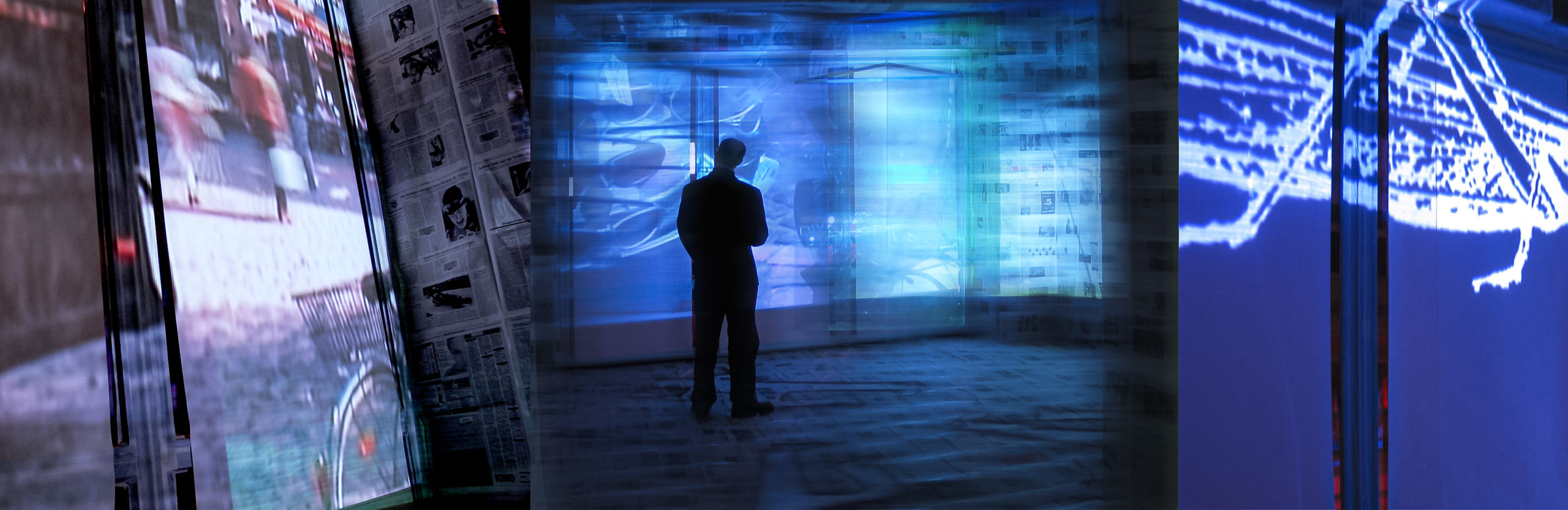 Moving images goes around on the walls, sweeping over newspapers from different countries in several languages. The room prepared as a scene of crime with outlined bodies that has been removed, the only thing that remains is the blinking light of a policecar and the moving images from the city scape. Pedestrians and traffic moves slowly over the walls.