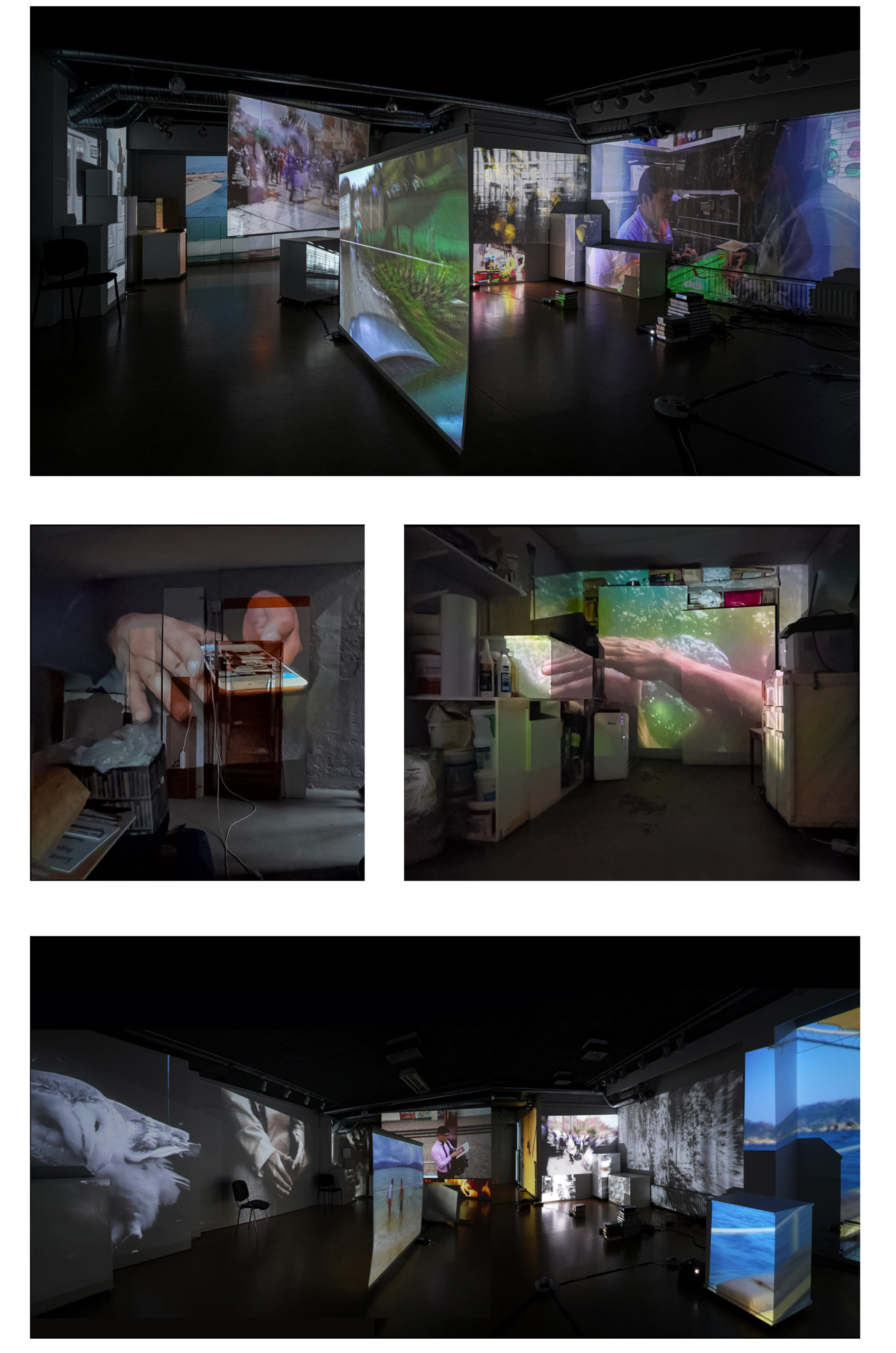 The installation is tailored to the venue where it will be presented, utilizing between 8-20 projectors depending on the space. Although some sound elements are present, the installation is predominantly silent. Each projector runs a loop lasting between 15-25 minutes, ensuring a constantly changing experience.
